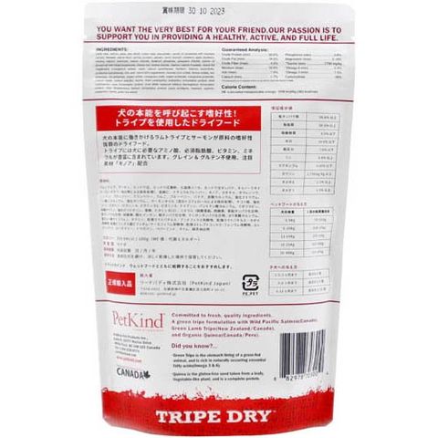 | ラムトライプ、サーモン、エンドウ豆、エンドウ豆澱粉、七面鳥ミール、エンドウ豆タンパク、キャノーラオイル(ローズマリー抽出物による保存処理)、亜麻仁、ナチュラルフレーバー、キノア、カボチャ、ホウレンソウ、ニンジン、ブロッコリー、クランベリー、りんご、ブルーベリー、バナナ、炭酸カルシウム、塩化ナトリウム、リン酸二カルシウム、塩化カリウム、サーモンオイル(混合トコフェロールによる保存処理)、チコリ根、塩化コリン、ビタミン(ビタミンA、ビタミン D3、ビタミンE、ナイアシン、パントテン酸カルシウム、リボフラビン、硝酸チアミン、塩化ピリドキシン、葉酸、ビタミン B12) 、ミネラル(硫酸亜鉛、硫酸鉄、亜鉛タンパク化合物、鉄タンパク化合物、硫酸銅、酸化マンガン、銅タンパク化合物、マンガンタンパク化合物、ヨウ素酸カルシウム、亜セレン酸ナトリウム)、タウリン、乾燥ラクトバチルス・アシドフィラス発酵物、乾燥ラクトバチルス・カゼイ発酵物、乾燥ビフィズス菌ビフィダム・サーモフィラム発酵物、乾燥ストレプトコッカス・フェシウム発酵物、ユッカシジケラ、ローズマリー、トウガラシ、ペパーミント、タイム、緑茶抽出物 |