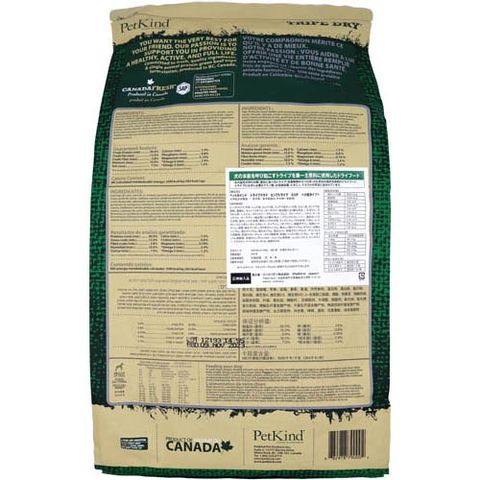 | ビーフトライプ、牛肉、レンズ豆、エンドウ豆、エンドウ豆タンパク質、ひよこ豆、エンドウ豆澱粉、亜麻仁、キャノーラオイル(ローズマリー抽出物により酸化防止)、かぼちゃ、ほうれん草、にんじん、ブロッコリー、クランベリー、りんご、ブルーベリー、バナナ、サーモンオイル(ローズマリー抽出物により酸化防止)、ナチュラルフレーバー、亜鉛タンパク化合物、鉄タンパク化合物、銅タンパク化合物、マンガンタンパク化合物、ビタミンA、ビタミンD3、ビタミンB12、ビタミンE、ナイアシン、リボフラビン、硝酸チアミン、塩酸ピリドキシン、葉酸、酸化マンガン、ヨウ素カルシウム、亜セレン酸ナトリウム、タウリン、炭酸カルシウム、塩化ナトリウム、塩化カリウム、塩化コリン、乾燥ラクトバチルス・アシドフィラス発酵物、乾燥ラクトバチルス・カゼイ発酵物、乾燥ビフィズス菌ビフィダム・サーモフィラム発酵物、乾燥ストレプトコッカス・フェシウム発酵物、ユッカシジケラ、ローズマリー、トウガラシ、ペパーミント、タイム、緑茶エキス |