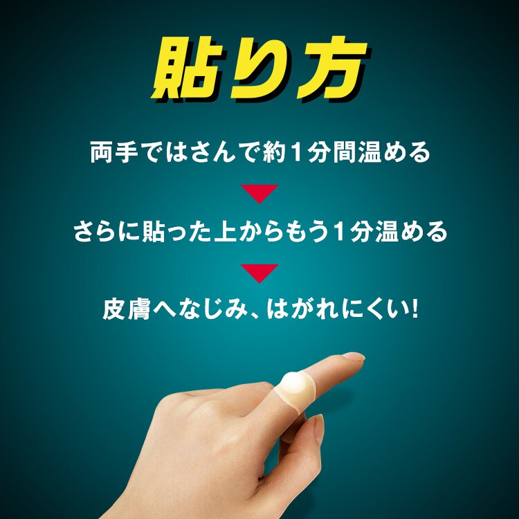 | ・切り傷、すり傷、さし傷、かき傷、靴ずれ等の創傷及び軽度の熱傷(やけど)の「治癒の促進」、「痛みの軽減」、「湿潤環境の維持」、「保護」 ※にきび、湿疹、虫さされ、皮膚炎などの症状には使用できません。 |