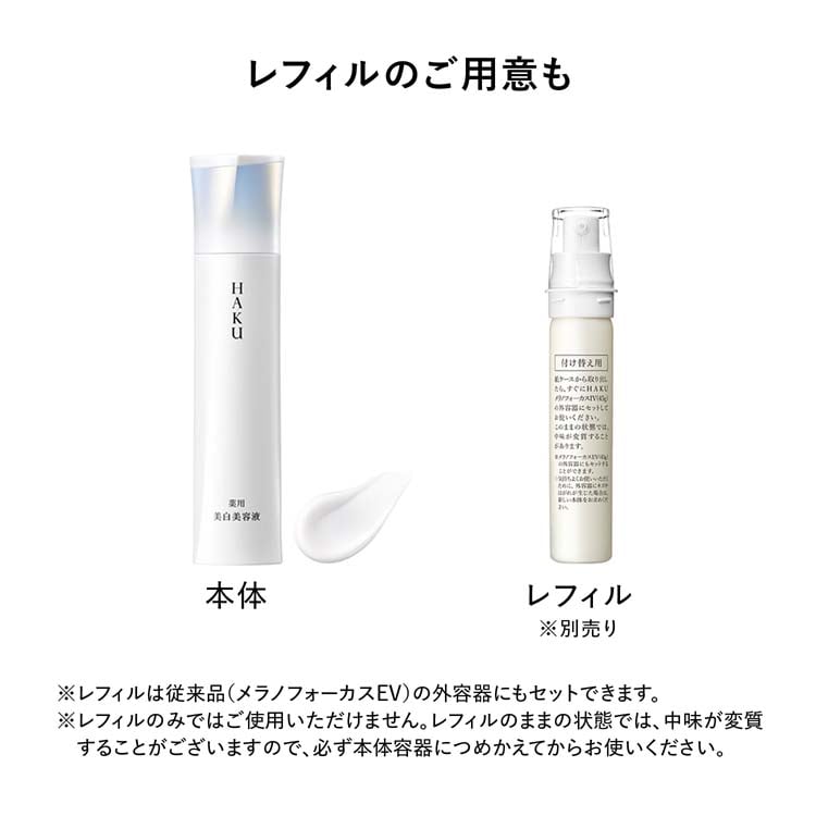 (メラノフォーカスIV 「レフィル」)本品は付け替え用レフィルです。このままではご使用いただけません。HAKU メラノフォーカスIV(45g)の外容器にセットしてお使いください。※メラノフォーカスEV(45g)の外容器にもセットすることができます。 ・朝・夜の化粧水の後に、ディスペンサー2回押し分を手にとり、顔全体に広げます。・気になる部分を中心に軽くおさえ、顔全体にていねいになじませます。