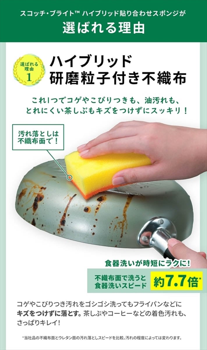 ●ハイブリッド研磨粒子つきの不織布面で、コゲやこびりつき、茶渋まで落とす