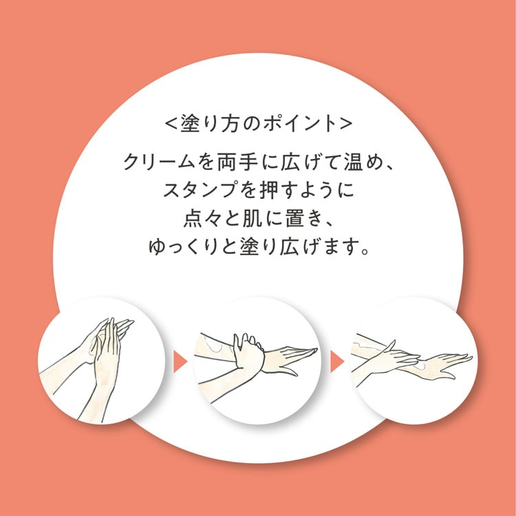 肌を清潔にした後、手のひらに適量をとり、やさしくなじませます。