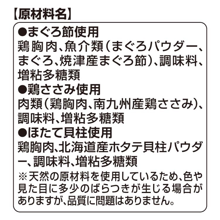 ★まぐろ節:鶏胸肉、魚介類(まぐろパウダー、まぐろ、焼津産マグロ節)、調味料、増粘多糖類