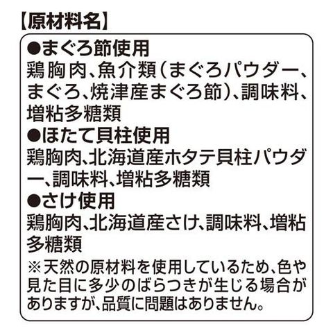 | ★まぐろ節:鶏胸肉、魚介類(まぐろパウダー、まぐろ、焼津産まぐろ節)、調味料、増粘多糖類 ★ほたて貝柱:鶏胸肉、北海道産ホタテ貝柱パウダー、調味料、増粘多糖類 ★さけ:鶏胸肉、北海道産さけ、調味料、増粘多糖類 ※天然の原材料を使用しているため、色や見た目に多少のばらつきが生じる場合がありますが、品質に問題はありません。 |