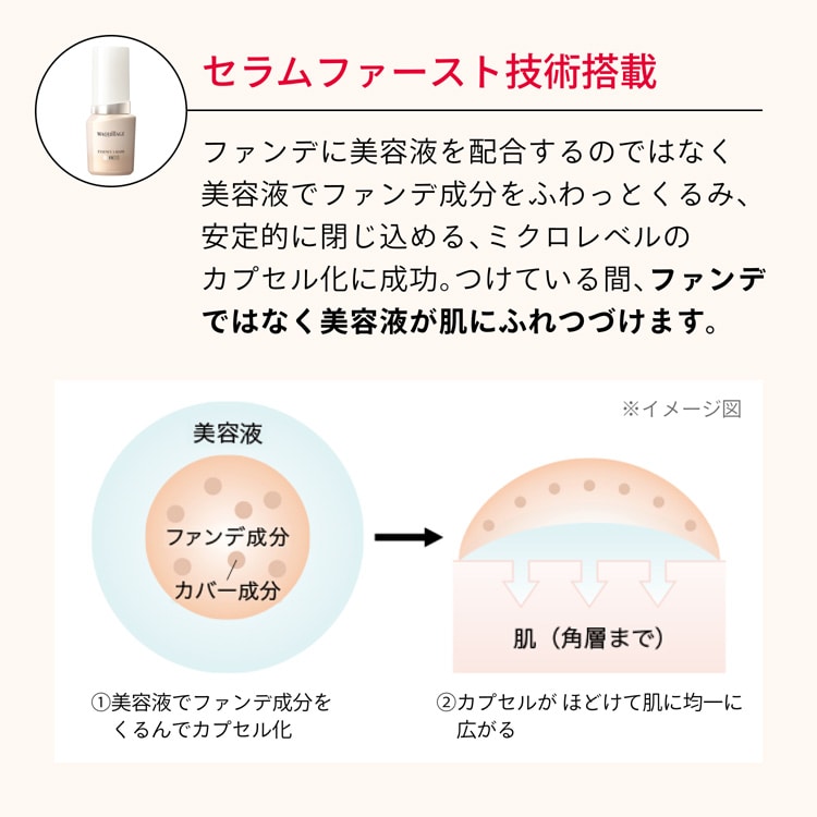 ●美容液でファンデ成分を包みこみ美容液が肌にずっとふれる「セラムファースト技術」を搭載した、ファンデ美容液。