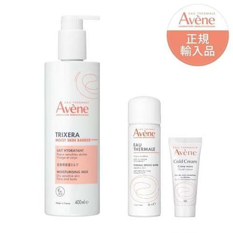 | ・アベンヌ トリクセラモイストスキンバリアミルク400mL×1本 ・アベンヌウオーター50g×1本 ・アベンヌ 薬用ハンドクリーム10g×1本 |