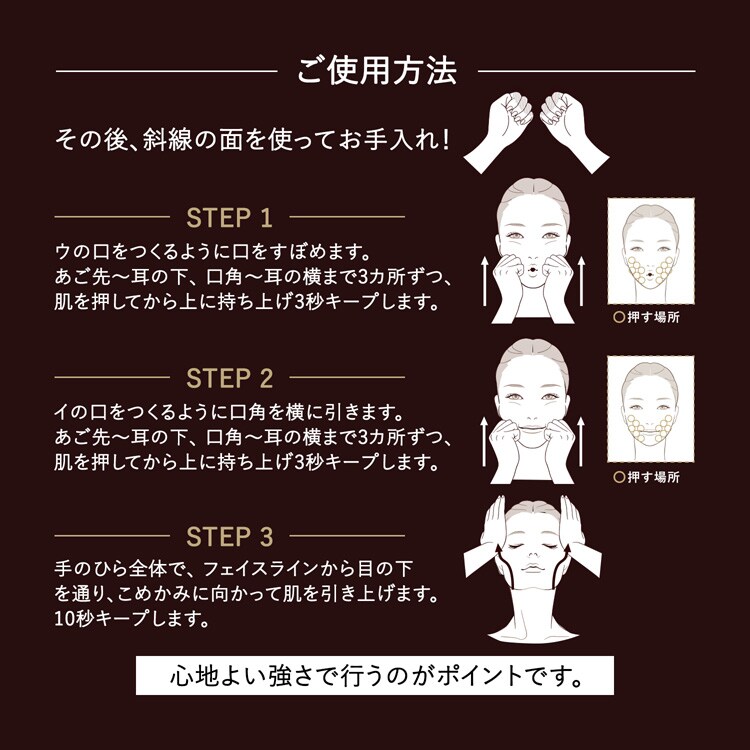・(1)ー(4)の要領で、肌を持ち上げるようにお手入れします。