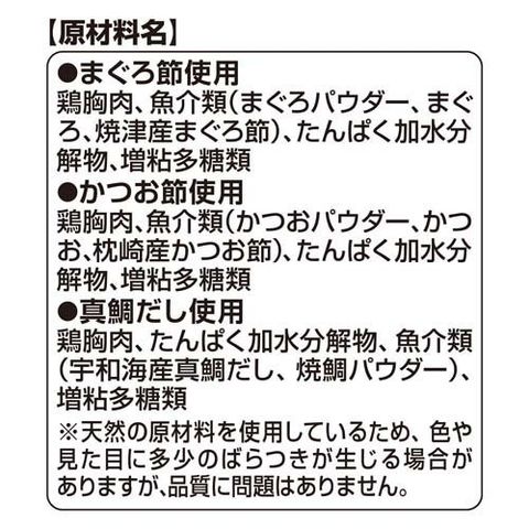 | ★無添加とろリッチ3種アソート まぐろ節使用:鶏胸肉、魚介類(まぐろパウダー、まぐろ、焼津産まぐろ節)、たんぱく加水分解物、増粘多糖類 かつお節使用:鶏胸肉、魚介類(かつおパウダー、かつお、枕崎産かつお節)、たんぱく加水分解物、増粘多糖類 真鯛だし使用:鶏胸肉、たんぱく加水分解物、魚介類(宇和海産真鯛だし、焼鯛パウダー)、増粘多糖類※天然の原材料を使用しているため、色や見た目に多少のばらつきが生じる場合がありますが、品質に問題はありません。 ★3種のシーフード味アソートまぐろほたてさけ まぐろ節使用:鶏胸肉、魚介類(まぐろパウダー、まぐろ、焼津産まぐろ節)、調味料、増粘多糖類 ほたて貝柱使用:鶏胸肉、北海道産ホタテ貝柱パウダー、調味料、増粘多糖類 さけ使用:鶏胸肉、北海道産さけ、調味料、増粘多糖類※天然の原材料を使用しているため、色や見た目に多少のばらつきが生じる場合がありますが、品質に問題はありません。 ★とろリッチ3種アソートまぐろかつおたい まぐろ節使用:鶏胸肉、魚介類(まぐろパウダー、まぐろ、焼津産まぐろ節)、調味料、増粘多糖類 かつお節使用:鶏胸肉、魚介類(かつおパウダー、かつお、枕崎産かつお節)、調味料、増粘多糖類 真鯛だし使用:鶏胸肉、魚介類(宇和海産真鯛だし、焼鯛パウダー)、調味料、増粘多糖類※天然の原材料を使用しているため、色や見た目に多少のばらつきが生じる場合がありますが、品質に問題はありません。 ★総合栄養食とろリッチ3種アソートお魚・鶏ささみ まぐろ節使用:鶏胸肉、魚介類(まぐろ、かつお、焼津産まぐろ節)、植物性油脂、セルロースパウダー、増粘多糖類、調味料、ミネラル類(Ca、Cl、Co、Cu、Fe、I、K、Mn、P、Zn)、ビタミン類(A、B1、B2、B6、B12、C、D、E、K、コリン、ナイアシン、パントテン酸、ビオチン、葉酸)、アミノ酸(タウリン) かつお節使用:鶏胸肉、魚介類(かつお、まぐろ、枕崎産かつお節)、植物性油脂、セルロースパウダー、増粘多糖類、調味料、ミネラル類(Ca、Cl、Co、Cu、Fe、l、K、Mn、P、Zn)、ビタミン類(A、B1、B2、B6、B12、C、D、E、K、コリン、ナイアシン、パントテン酸、ビオチン、葉酸)、アミノ酸(タウリン) 鶏ささみ使用:肉類(鶏胸肉、南九州産鶏ささみ)、魚介類(かつお、まぐろ)、植物性油脂、セルロースパウダー、増粘多糖類、調味料、ミネラル類(Ca、Cl、Co、Cu、Fe、l、K、Mn、P、Zn)、ビタミン類(A、B1、B2、B6、B12、C、D、E、K、コリン、ナイアシン、パントテン酸、ビオチン、葉酸)、アミノ酸(タウリン)※天然の原材料を使用しているため、色や見た目に多少のばらつきが生じる場合がありますが、品質に問題はありません。 |
