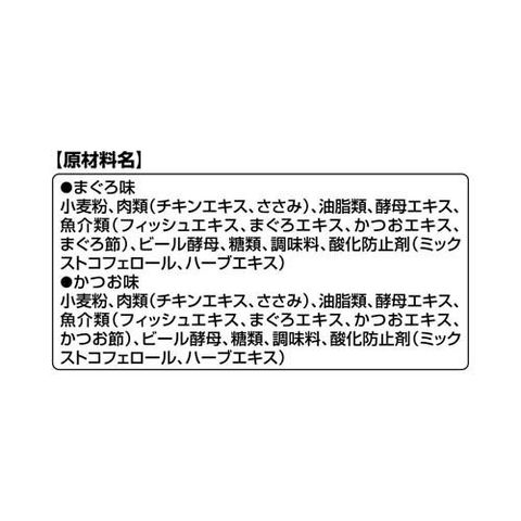| ★クッキーサンド2種アソートまぐろ&かつお味 まぐろ味:小麦粉、肉類(チキンエキス、ささみ)、油脂類、酵母エキス、魚介類(フィッシュエキス、まぐろエキス、かつおエキス、まぐろ節)、ビール酵母、糖類、調味料、酸化防止剤(ミックストコフェロール、ハーブエキス) かつお味:小麦粉、肉類(チキンエキス、ささみ)、油脂類、酵母エキス、魚介類(フィッシュエキス、まぐろエキス、かつおエキス、かつお節)、ビール酵母、糖類、調味料、酸化防止剤(ミックストコフェロール、ハーブエキス) ★クリームどーにゃつ2種のアソートまぐろ&チキン味 まぐろ味:肉類(ビーフミール、チキンミール、チキンエキス、ポークミール)、穀類(小麦粉、米粉、麦芽粉末)、油脂類、ビール酵母、豆類(大豆タンパク)、魚介類(フィッシュエキス、まぐろミール)、マルトデキストリン、チーズパウダー、糖類、調味料、ミネラル類(カルシウム、塩素、ナトリウム)、酸化防止剤(ミックストコフェロール、ハーブエキス) まぐろ入りチキン味:肉類(ビーフミール、チキンミール、チキンエキス、ポークミール)、穀類(小麦粉、米粉、麦芽粉末)、油脂類、ビール酵母、豆類(大豆タンパク)、魚介類(フィッシュエキス、まぐろミール)、マルトデキストリン、チーズパウダー、糖類、調味料、ミネラル類(カルシウム、塩素、ナトリウム)、酸化防止剤(ミックストコフェロール、ハーブエキス) ★クリームどーにゃつ2種のアソートまぐろ&かつお味 まぐろ味:肉類(ビーフミール、チキンミール、チキンエキス、ポークミール)、穀類(小麦粉、米粉、麦芽粉末)、油脂類、ビール酵母、豆類(大豆タンパク)、魚介類(フィッシュエキス、まぐろミール)、マルトデキストリン、チーズパウダー、糖類、調味料、ミネラル類(カルシウム、塩素、ナトリウム)、酸化防止剤(ミックストコフェロール、ハーブエキス) かつお味:肉類(ビーフミール、チキンミール、チキンエキス、ポークミール)、穀類(小麦粉、米粉、麦芽粉末)、油脂類、ビール酵母、豆類(大豆タンパク)、魚介類(フィッシュエキス、まぐろミール、かつおミール)、マルトデキストリン、チーズパウダー、糖類、調味料、ミネラル類(カルシウム、塩素、ナトリウム)、酸化防止剤(ミックストコフェロール、ハーブエキス) |