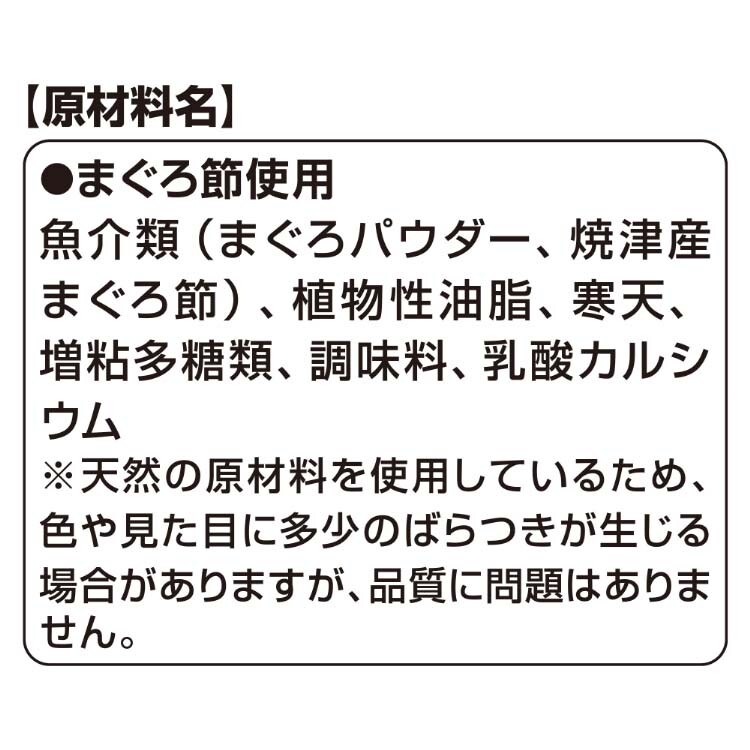 | まぐろ節使用/魚介類(まぐろパウダー、焼津産まぐろ節)、植物性油脂、寒天、増粘多糖類、調味料、乳酸カルシウム ※天然の原材料を使用しているため、色や見た目に多少のばらつきが生じる場合がありますが、品質に問題はありません。 |