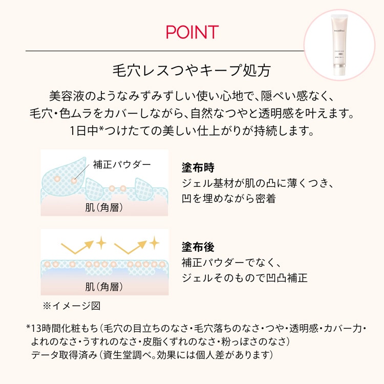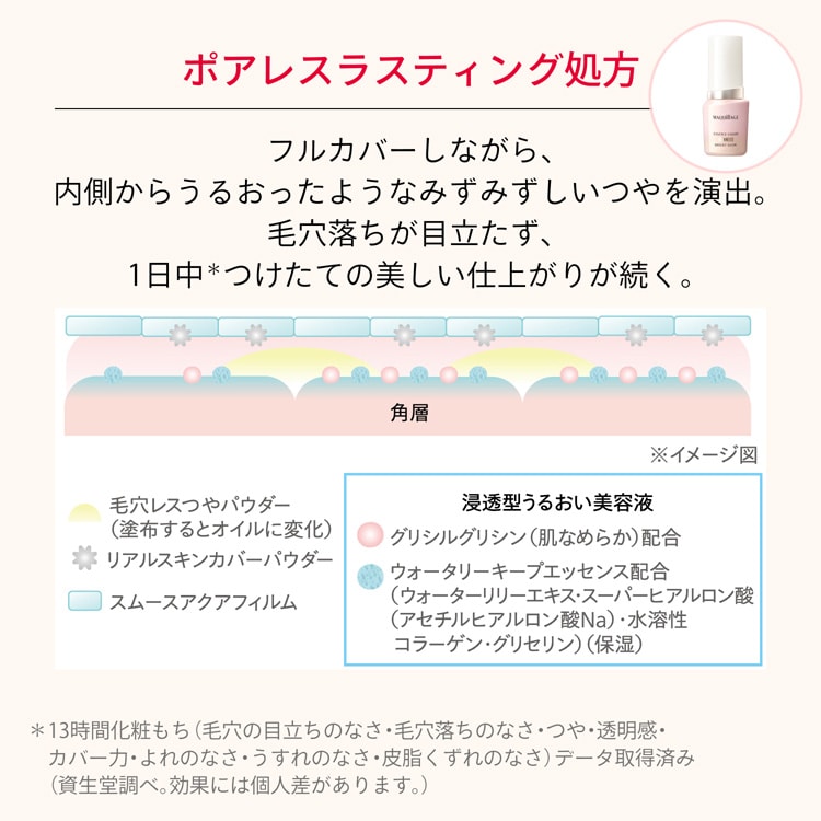 ※長時間化粧もち(毛穴の目立ちのなさ・毛穴落ちのなさ・つや・透明感・カバー力・よれのなさ・うすれのなさ・皮脂くずれのなさ・粉っぽさのなさ)データ取得済み(メーカー調べ。効果には個人差があります。)