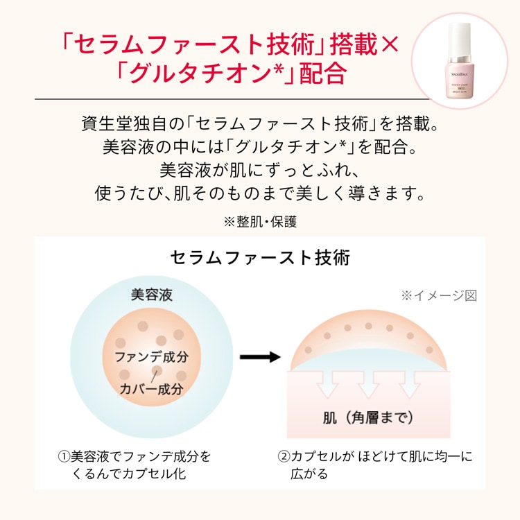 ●美容液でファンデ成分を包み込むから美容液が肌にずっとふれる技術(セラムファースト技術)。