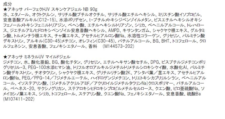 | ・アネッサ パーフェクトUV スキンケアジェル NB 90g ・アネッサ ミネラルUV マイルドジェル 90g ・アネッサ パーフェクトUV スキンケアジェル NB 15g |