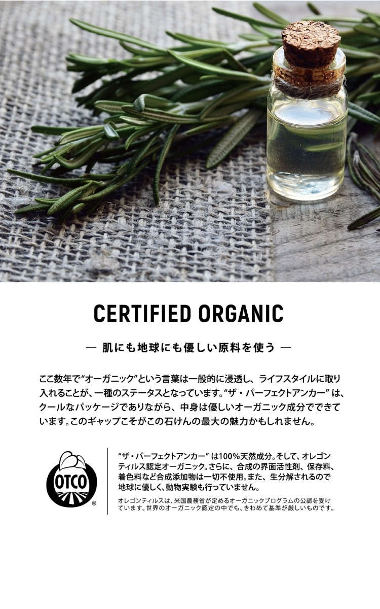 きわめて基準が厳しいオレゴンティルス認定オーガニック。生分解されるため地球に優しく、動物実験も行っておりません。