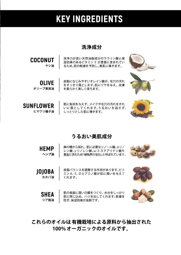 | 水、ヤシ油*、水酸化K、オリーブ果実油*、香料(エッセンシャルオイル)、ヒマワリ種子油*、トコフェロール(ビタミンE)、アサ種子油*、ホホバ種子油*、シア脂油*、クエン酸 *オーガニック成分(オイルが石鹸化する際にできるグリセリンは、そのまま残っております。) |