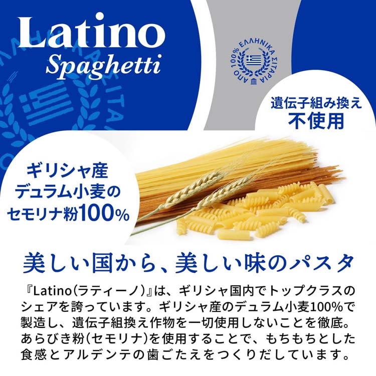 ●美しい国から、美しい味のパスタ。小麦の国ギリシャで生まれた「Latino ( ラティーノ )」は、ギリシャ国内でトップクラスのシェアを誇っています。ギリシャ産のデュラム小麦100%で製造し、遺伝子組換え作物を一切使用しないことを徹底。あらびき粉(セモリナ)を使用することで、もちもちとした食感とアルデンテの歯ごたえをつくりだしています。