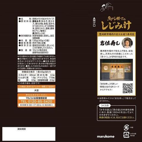 ●豊洲市場場内の玄人も通う有名店「岩佐寿司」監修のインスタントみそ汁。信州赤系粒みそ・中京豆みその合わせみそとしじみの風味あふれる生タイプ調味みそに、レトルトの殻付きしじみを組み合わせ築地魚がし横丁の名店監修のしじみの滋味あふれるお味噌汁です。