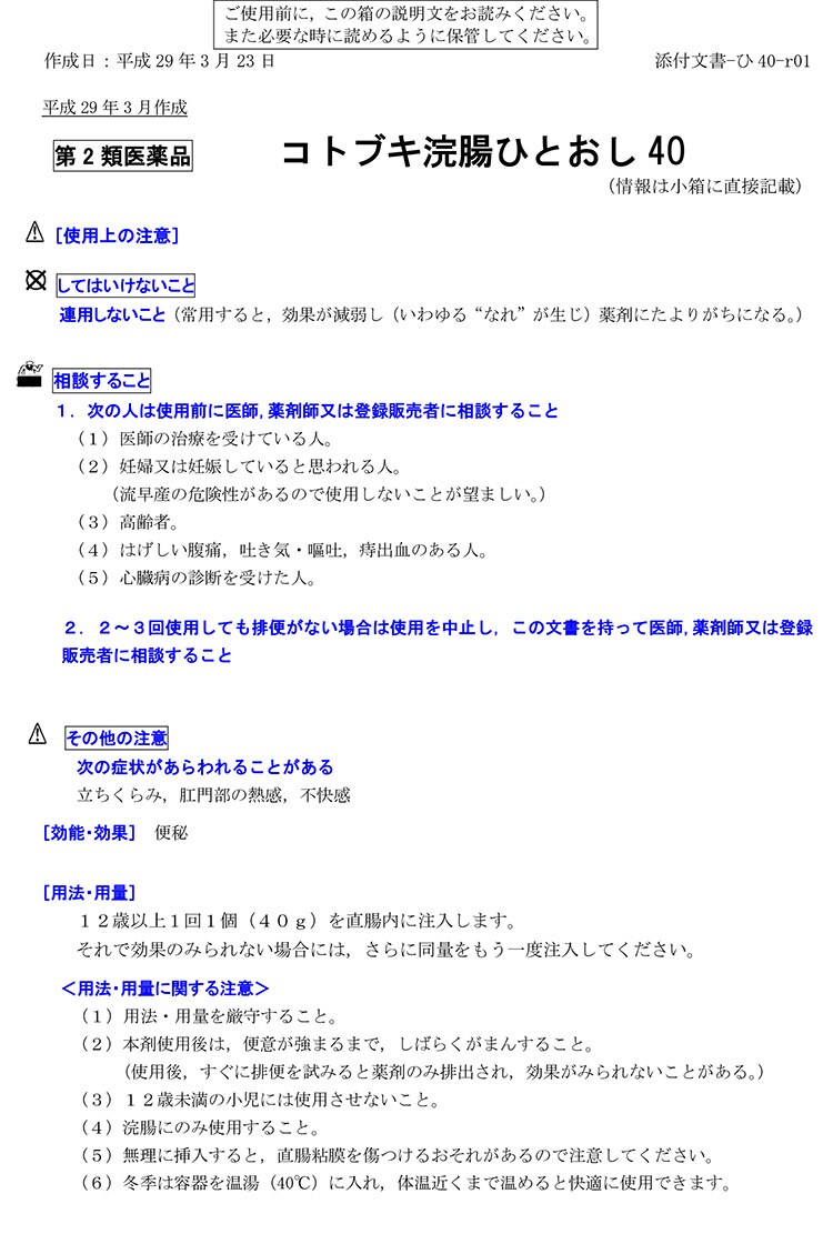 2.2-3回使用しても排便がない場合は使用を中止し、この文書を持って医師、薬剤師又は登録販売者に相談すること