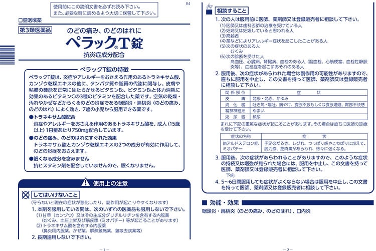 ●ペラックT錠は、炎症やアレルギーをおさえる作用のあるトラネキサム酸、カンゾウ乾燥エキスの他に、タンパク質や脂質の代謝に関与し、皮膚や粘膜の機能を正常にはたらかせるビタミンB2、ビタミンB6と体力消耗に効果のあるビタミンCの3種のビタミンを配合した薬です。空気の乾燥・汚れやかぜなどからくるのどの炎症である咽頭炎・扁桃炎(のどの痛み、のどのはれ)によく効き、7歳の小児から服用できる薬です。
