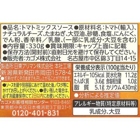 | トマト(輸入)、ナチュラルチーズ、たまねぎ、大豆油、砂糖、食塩、にんにく、でん粉、香辛料/乳酸、(一部に乳成分・大豆を含む) |