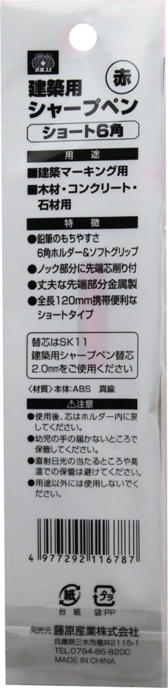 | 色:赤。芯太さ:2.0mm。全長:約120mm。適合替芯:SK11建築用シャープペン替芯24本。(材質)本体:ABS・真鍮。芯:顔料。 |