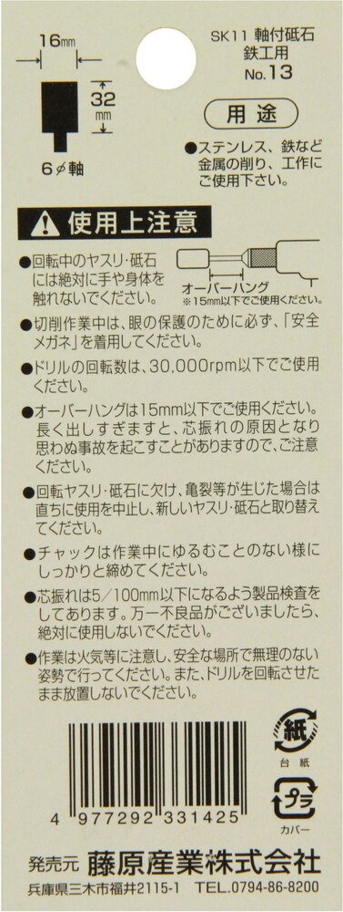 | ・軸径:6mm ・砥石部分巾:16mm ・長さ:32mm ・粒度:WA60P ・適用機種:電気ドリル・エアーグラインダー |