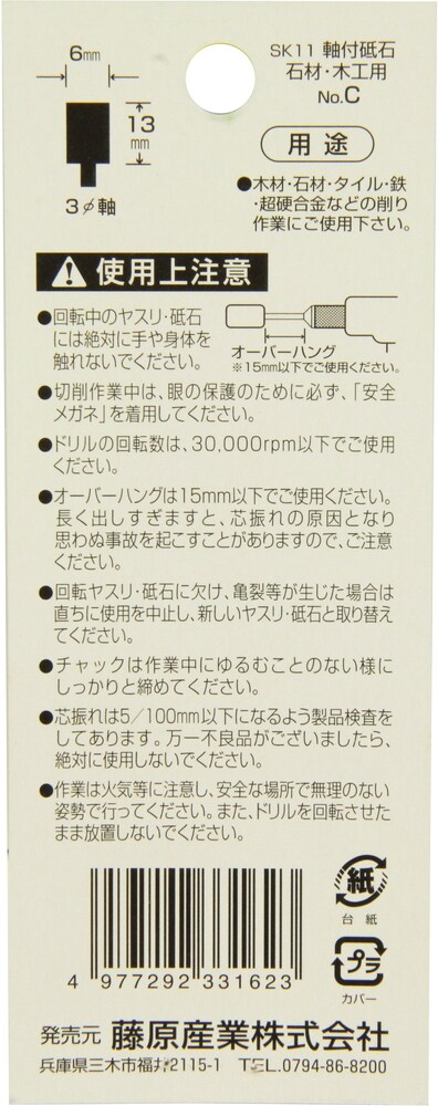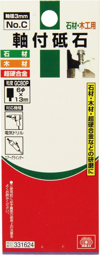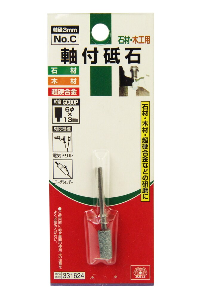 | ・軸径:3mm ・砥石部分巾:6mm ・長さ:13mm ・粒度:GC80P ・適用機種:電気ドリル・エアーグラインダー |