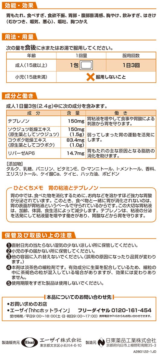 | ★成分と働き 成人1日量3包(2.4g)中に次の成分を含みます。 (成分:含量:働き) テプレノン:150mg:胃粘液を増やして食事や胃酸による刺激から胃を守ります。 ソウジュツ乾燥エキス(原生薬としてソウジュツ):150mg(1.5g):弱ってしまった胃の運動を活発にします。 コウボク乾燥エキス(原生薬としてコウボク):83.4mg(1.0g):弱ってしまった胃の運動を活発にします。 リパーゼAP6:14.7mg:胃もたれの主な原因となる脂肪の消化を助けます。 (添加物)タルク、乳糖、バニリン、ビタミンE、D-マンニトール、l-メントール、香料、エリスリトール、ケイ酸Ca、ケイヒ、ハッカ油、ポビドン |