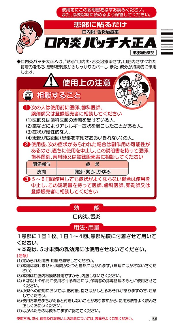 ●口内炎パッチ大正Aは、「貼る」口内炎・舌炎治療薬です。