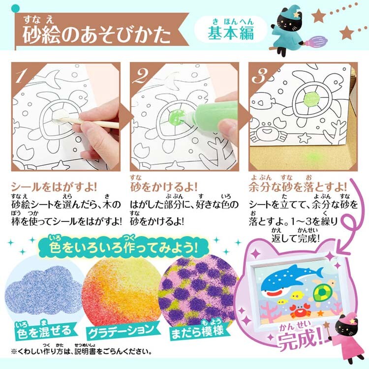 ●イラストシートのシールをはがして、さらさらカラー砂をかけるだけで、ステキな絵を描ける!