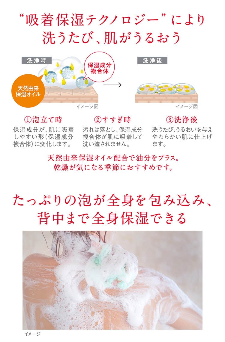 ●「吸着保湿テクノロジー」で保湿成分とエモリエントオイルを肌にしっかり吸着させ、うるおいが長く続きます。