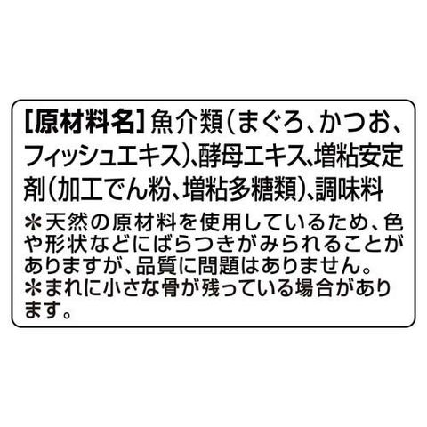 | 魚介類(まぐろ、かつお、フィッシュエキス)、酵母エキス、増粘安定剤(加工でん粉、増粘多糖類)、調味料*天然の原材料を使用しているため、色や形状などにばらつきがみられることがありますが、品質に問題はありません。*まれに小さな骨が残っている場合があります。 |