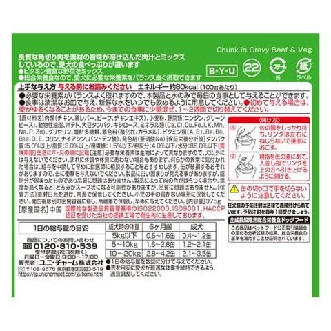| 肉類(チキン、鶏レバー、ビーフ、チキンエキス)、小麦粉、野菜類(ニンジン、グリーンピース)、動物性油脂、ポテト、大豆タンパク、キシロース、ミネラル類(Ca、Cl、Cu、Fe、I、K、Mn、Na、P、Zn)、グリセリン、増粘多糖類、着色料(酸化鉄、カラメル)、ビタミン類(A、B1、B2、B6、B12、D、E、コリン、ナイアシン、パントテン酸)、発色剤(亜硝酸Na) |
