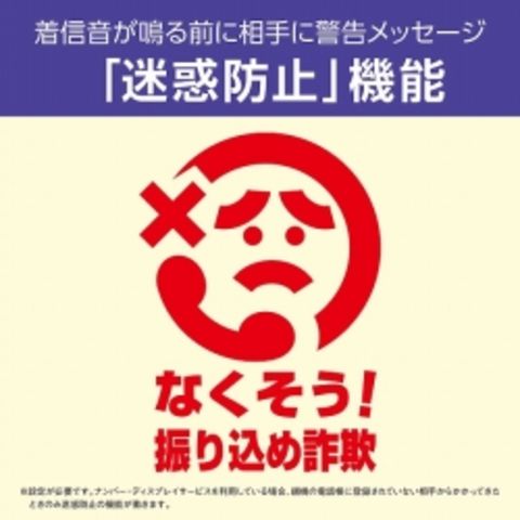 1.電話線は親機につなぐだけ(※親機は電話機コードとACアダプターの接続が必要です。※)、宅内のお好きな場所に設置できる(※子機の充電台は電源コンセントへの接続が必要です。また、本機は防水仕様ではありませんのでキッチンや浴室などでは使わないでください。※)(※コードレス子機の使用可能距離は親機との間に障害物がない状態で約100 m。壁やドアなどの障害物がある場合、使用距離は短くなります。※)。2.着信音が鳴る前に相手に警告メッセージを流す「迷惑防止(※設定が必要です。ナンバー・ディスプレイサービスを利用している場合、付属子機の電話帳に登録されていない相手からかかってきたときのみ迷惑防止の機能が働きます。※)」機能搭載。3.子機が光って分かりやすい「着信お知らせLED」。