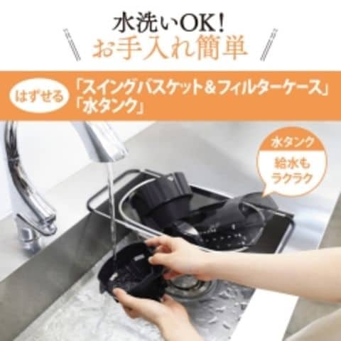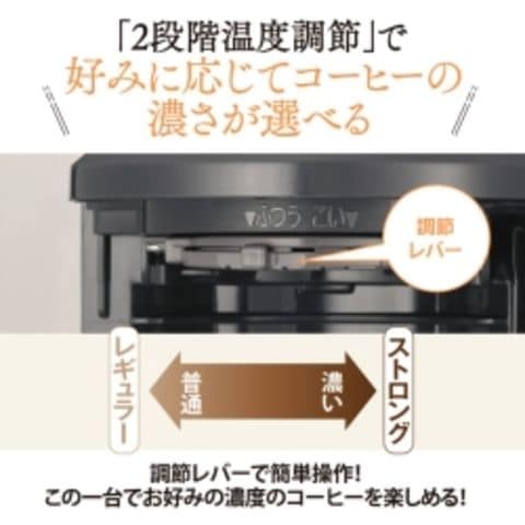 ●コーヒー本来のコクと香りを引き出す「ダブル加熱高温抽出」。水をヒーターで2回加熱し、熱湯と蒸気でコーヒー豆全体を蒸らしてから抽出します。●お好みに応じてコーヒーの濃さが選べる「2段階濃度調節」。「レギュラー(ふつう)」「ストロング(濃い)」レバー式濃度調節でお好みの濃さに抽出できます。●カルキをとってコーヒー豆本来のおいしさを引き出す「浄水フィルター」●はずせて洗えるのでお手入れ簡単な「スイングバスケット&フィルターケース」●はずせる「水タンク」。使うたびに洗えて清潔。毎回の給水もお手入れもラクラク簡単●フィルターケースからコーヒーのポタ落ちを防ぐしずくもれ防止機構