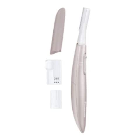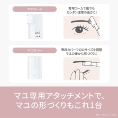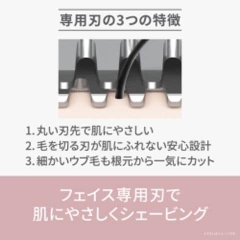 1.丸い刃先で肌にやさしい、約0.12mmのうす刃。水なしですっきり剃れる。2.肌の凸凹に合わせて動く、密着スイングヘッド。3.マユのお手入れができる。マユカバーとマユコーム付き。