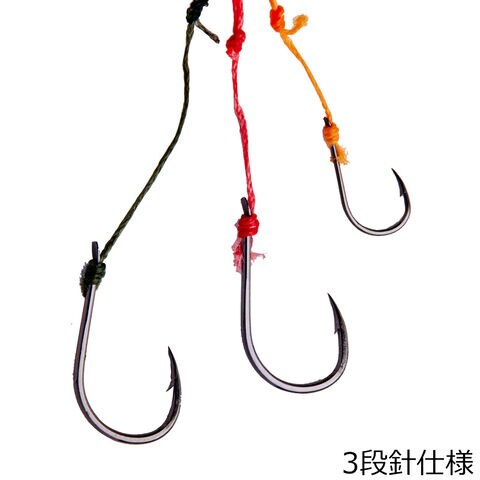 しっかりと掛けるメインフック2本とヘッドにアタックした小さめの鯛もきっちり掛ける孫針1本の3段針仕様。