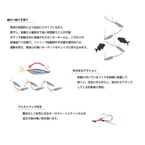 落下時には、振り子のように動き、巻き取り時には、左右にゆらゆら動く2wayアクションジグ。