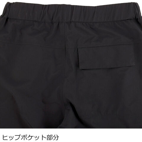 ウエスト部分はゴム&スピンドル入りで、腰回りにゆとりを持たせつつ裾を若干細くして足さばきがしやすいテーパードシルエットの3レイヤーレインパンツパターン設計でウエスト周りにゆとりを持たせ、