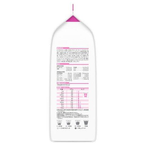 たんぱく質15.5%以上、脂質8.5%以上、粗繊維14.0%以下、灰分8.0%以下、水分10.0%以下