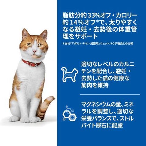 ◆脂肪分約33%オフ・カロリー約14%オフで、太りやすくなる避妊・去勢後の体重管理をサポート