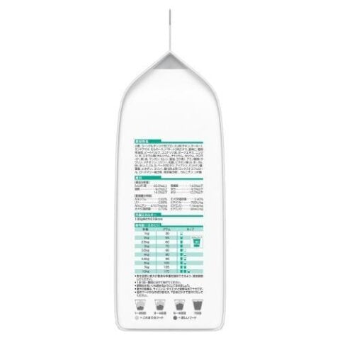 たんぱく質23.5%以上、脂質9.0%以上14.0%以下、粗繊維14.5%以下、灰分6.5%以下、水分10.0%以下、カルシウム0.82%、リン0.66%、カルニチン410.7mg/kg、オメガ3脂肪酸0.73%、オメガ6脂肪酸2.40%、ビタミンE:750IU/kg、ビタミンC:114mg/kg、ビタミンD:844IU/kg