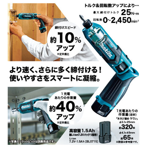 - 1充電あたりの作業量(目安):木ネジ ラワン 320本(φ3.1×25mm)、65本(φ4.1×45mm)