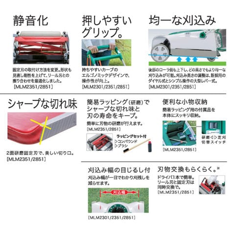 ◆固定刃と特殊熱処理を施した、らせん状の硬質鋼製リール刃の擦り合わせでシャープな切れ味に。