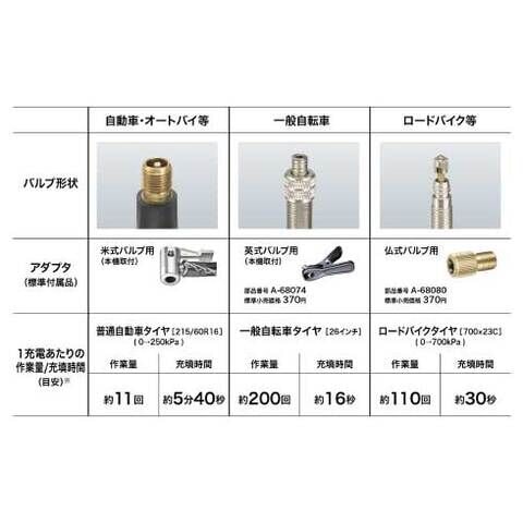※1充電あたりの作業量は、空気が入っていない状態から設定圧まで空気を入れた回数の参考値です。バッテリの充電状態や作業条件により異なります。