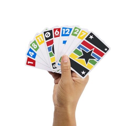 「オールマイティ」カードと「スキップ」カードがあり、「オールマイティ」カードは数字カードの代わりに使えるだけでなく、好きな色を使って好きなフェーズを完成できるまさにオールマイティなカード!
