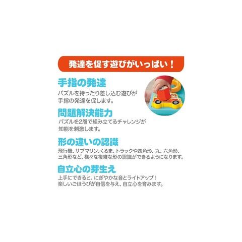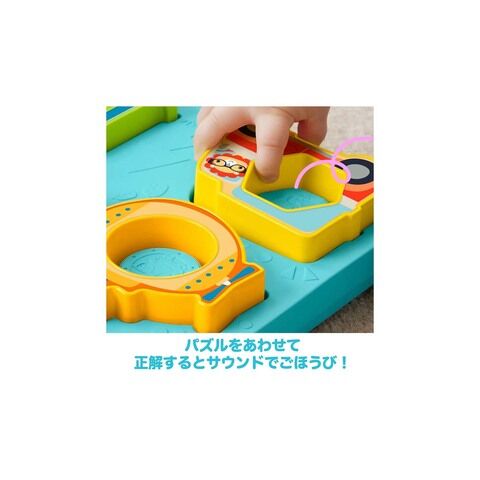 8個のパズルピースを正しい位置に置くと、乗り物や動物のサウンドとぴかぴか光るライトアップで正解を教えてくれます。
