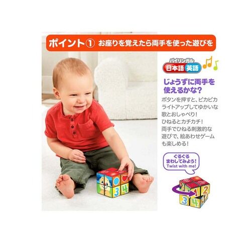 知育キューブを360度ひねって回して絵あわせゲームで遊ぼう。ひねるとカチカチと楽しい音も。