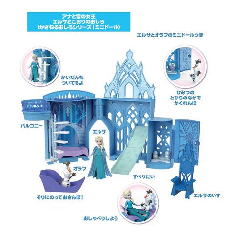 遊びの仕掛けがたくさんあり、エルサのミニドール以外にもオラフ、ゆきだるまのフィギュア2つ、エルサのイス、ソファが含まれます。