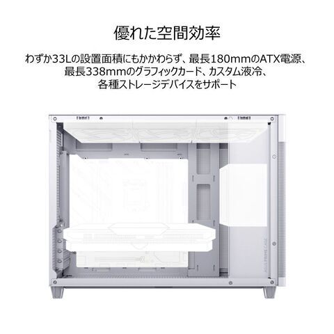 わずか33Lの設置面積にもかかわらず、最長180mmのATX電源、最長338mmのグラフィックカード、カスタム液冷、および各種ストレージデバイスをサポート